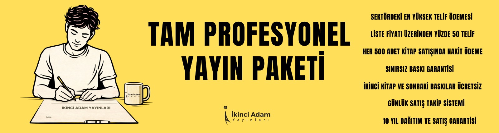 İkinci Adam Yayınları sektördeki hiçbir yayınevinin yapamadığı bir iş gerçekleştiriyor ve tam 10 yıl boyunca dağıtım ve satış garantisi veriyor. Sözleşmesine bu maddeyi koyabilen ve bu vaadinin arkasına tek yayıneviyiz. 10 yıl yazardan depolama ücreti almayacağımızı sözleşme maddesi ile garanti ediyoruz.